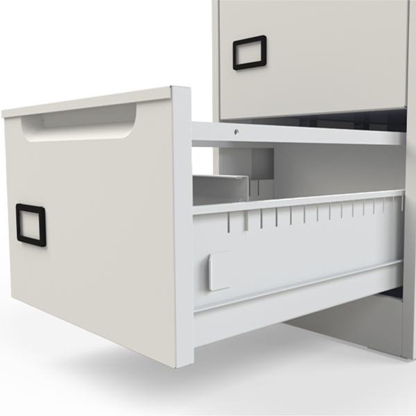 536mm. Cada gaveta cuenta con una división fabricada en lámina calibre 22/24. Rolado frío. Jaladera