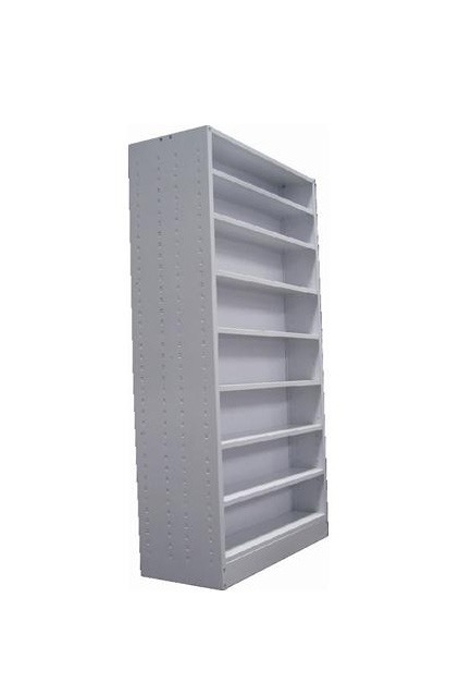 • Formado por dos laterales fabricados en lámina calibre 22, rolado en frío, doblados en forma de C con un dobladillo frontal de 9mm y tres caras de 25mmX192mmX24mm la cara de 192mm se encuentra deformada con una matriz de 2 columnasX37 filas con figura de panel bracket lance and form de distancia entre centros de 51mm en forma vertical y 104mm de manera horizontal en los cuales se inserten los entrepaños; en la parte inferior se encuentran dos perforaciones de 8mm DIA a paso de 73mm entre centros para colocar zoclo fabricado en lámina calibre 24 rolado frío con dos dobleces a lo largo y por cada lado de 13mmX23mm dejando un peralte de 113mm en la cual lleva dos perforaciones en forma de oblongo de 8mmX16mm que permiten ensamblarlos a los laterales por medio de tornillos de ¼”X1/2”, rondanas y tuercas galvanizadas y por la parte del fondo dos perforaciones más de 6.35mm DIA para colocar, en caso necesario pijas y reforzar el forro fabricado en melamina de caras blancas de 6mm de espesor y se coloca deslizándolo en un par de rieles que se encuentran punteados al lateral dejando formado un canal de 7mm con una pared de 16mm.