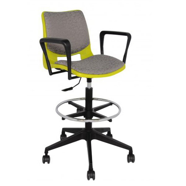 Base de estrella de 5 puntas en nylon de 25″ con aro cromado. Mecanismo fijo. Brazos de polipropileno. Asiento y respaldo conformados por una concha de polipropileno inyectado en una sola pieza con transferencia térmica. Colores: lima, mandarina, vino, celeste, gris y escarlata. Asiento y respaldo tapizados en tela a su elección de nuestro catálogo.